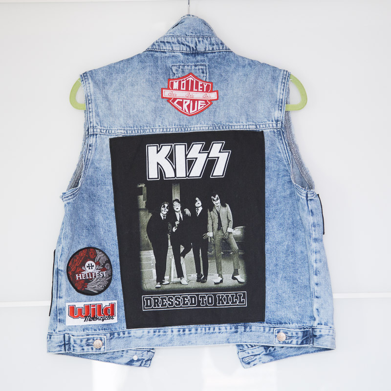Voir fleurir tous ces modèles m’a redonné l’envie de finir ma propre veste à patch, longuement préparée avec des écussons achetés lors de Hellfests successifs. Il n’y avait plus qu’à… Pour réaliser la mienne, je suis partie d’une veste en jean achetée très peu cher chez Forever 21. Je lui ai découpé les manches, puis ai cousu les différents patchs, soit à la machine avec une aiguille spécial jean, soit à la main (lorsque je ne voulais pas condamner les poches notamment).