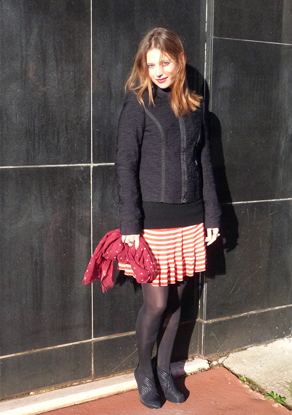 Wolford jacket, Hartford scarf, Bompard sweater on top of a Deby Debo dress already worn here, Wolford tights, United Nude shoes, Spell Designs necklace.