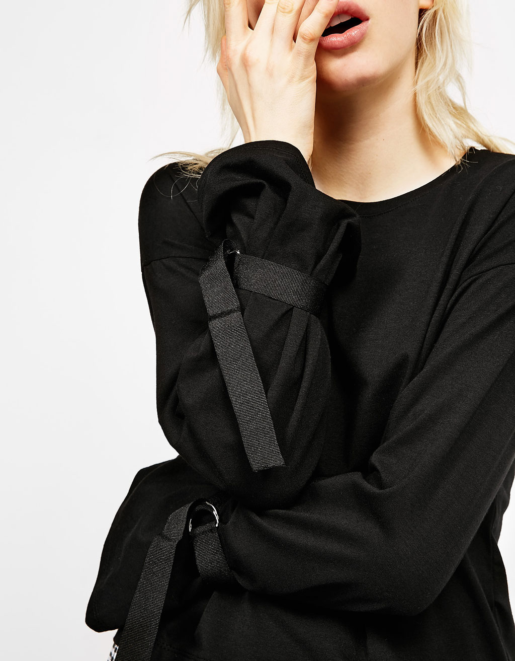 ou le ruban utilisé comme un lien de serrage : en version poignet avec des manches pagodes qui vont continuer à tremper dans la soupe au moindre geste (chez Bershka voir ci-dessous)