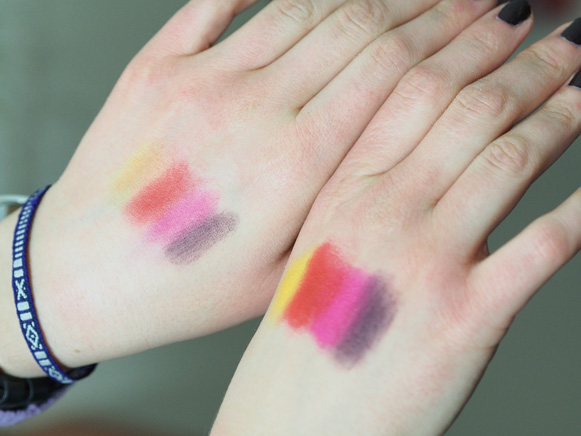 Below, on the left hand, the eyeshadows without the base. On the right hand, with the eyeshadow base.