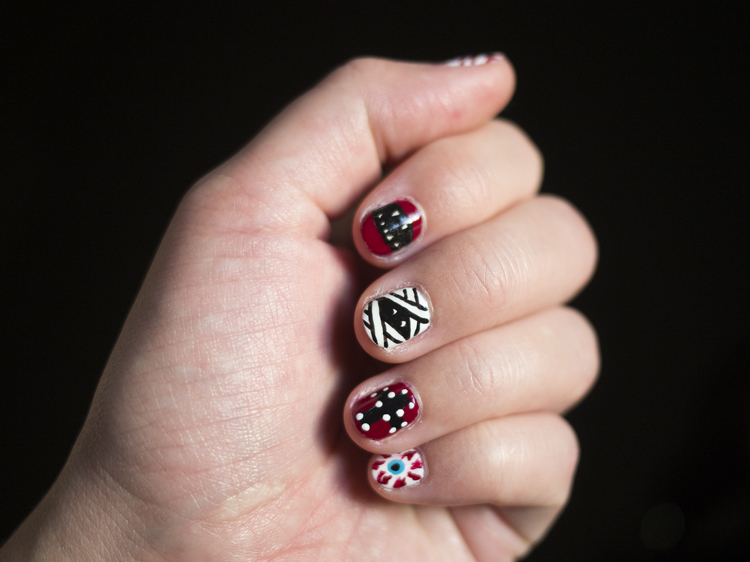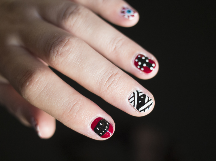 J’ai utilisé 3 vernis : un blanc, un rouge foncé et un bleu, ainsi que le Nail Art Pen noir du Club de Créateurs de Beauté. Mais je pense que de véritables liners spécifiques (du genre de ceux que l’on trouve chez Color Club ici) auraient donné un meilleur tracé, moins grossier. Il faudra que je teste à l’avenir…