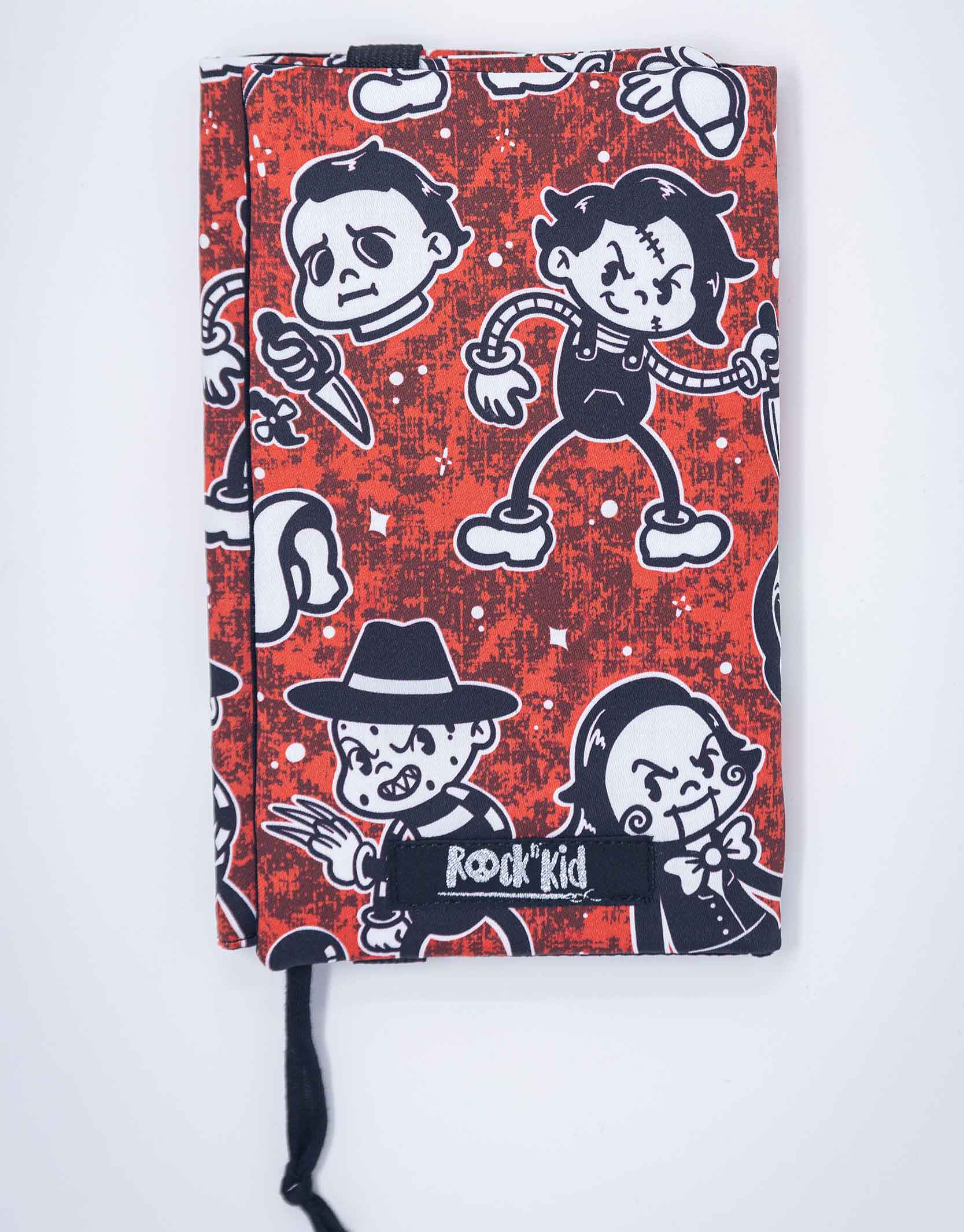 Couvre livre de poche motif exclusif horror cute, cousu main. Il s’adapte à l’épaisseur du livre de poche grâce à son rabat maintenu par un élastique.