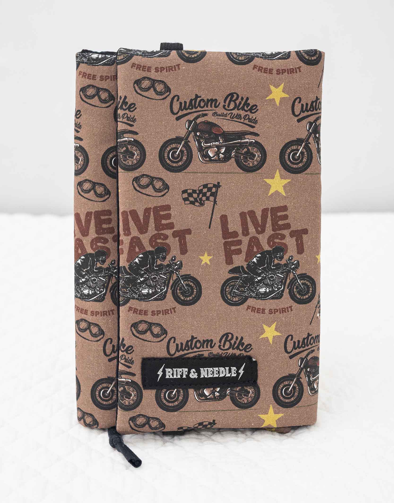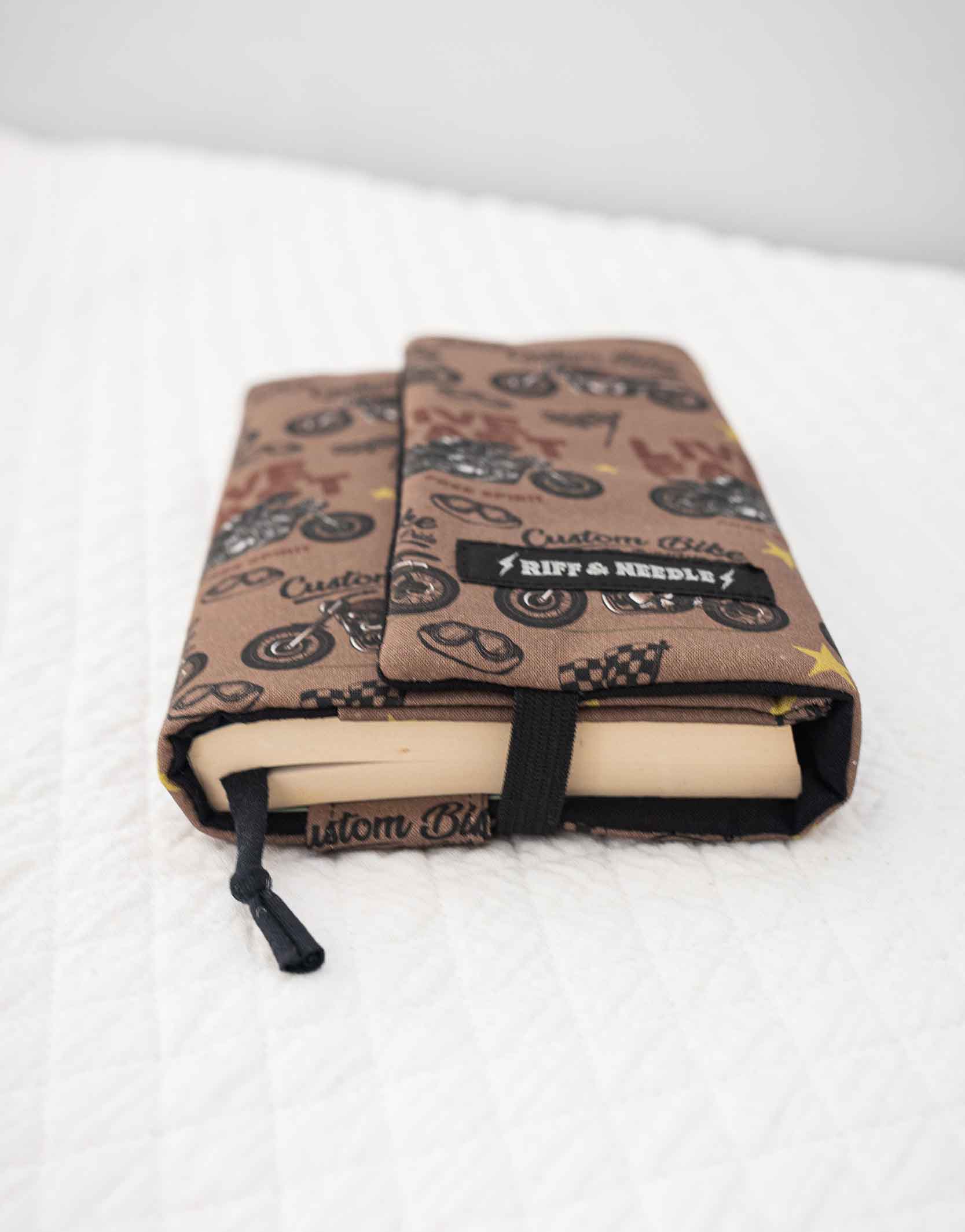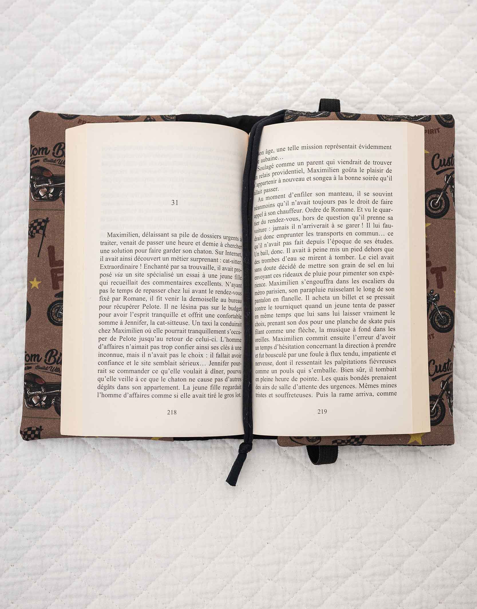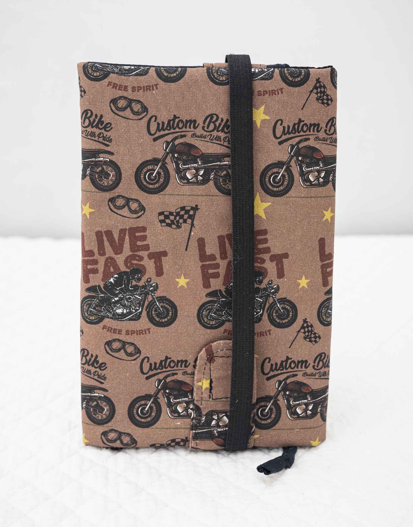 Couvre livre de poche motif exclusif moto, cousu main. Il s’adapte à l’épaisseur du livre de poche grâce à son rabat maintenu par un élastique.