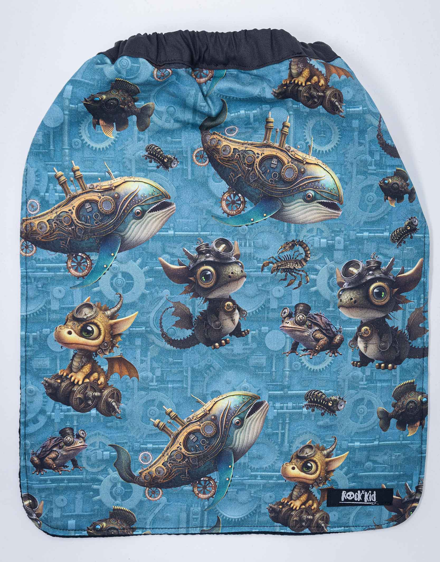 Serviette de table pour enfant avec élastique autour du cou pour enfilage facile, motif exclusif steampunk animaux. Doublure en éponge nid d’abeille.