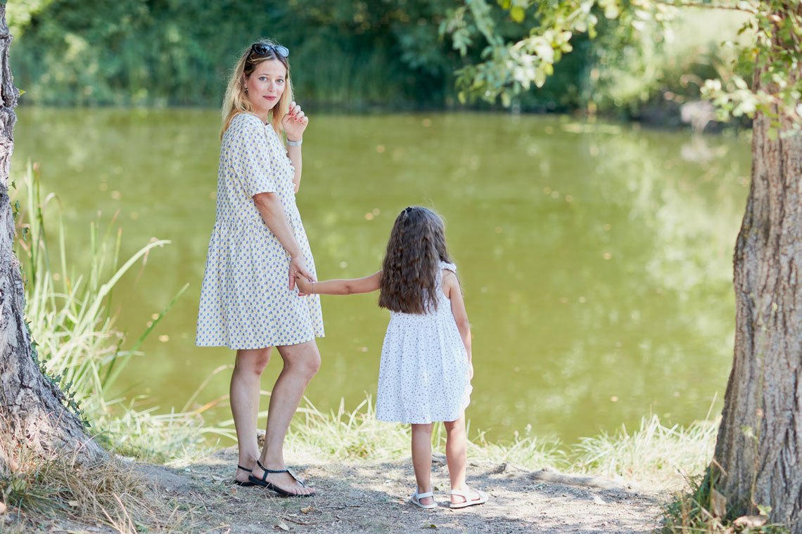 Cette robe est vendue en version fillette et en version femme : Elona MUM, et c’est celle-là que j’ai cousue ! Mon choix s’est porté sur une robe avec volant doublé sur le coté des boutons, sans poches et manches courtes. Elle est très ample, pour un tombé loose que j’aime bien. On peut limite prendre une taille en dessous de celle préconisée par le tableau des tailles si l’on veut une robe plus ajustée.